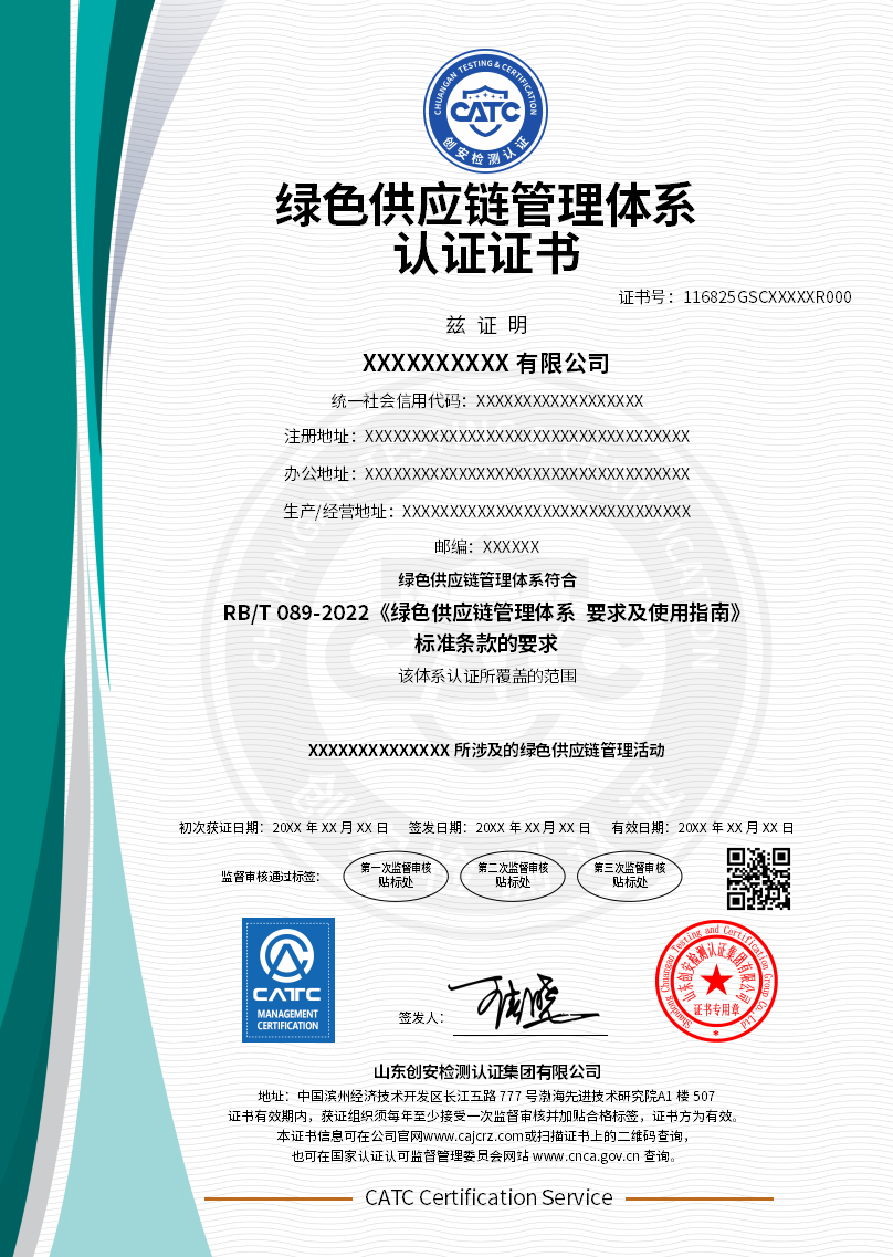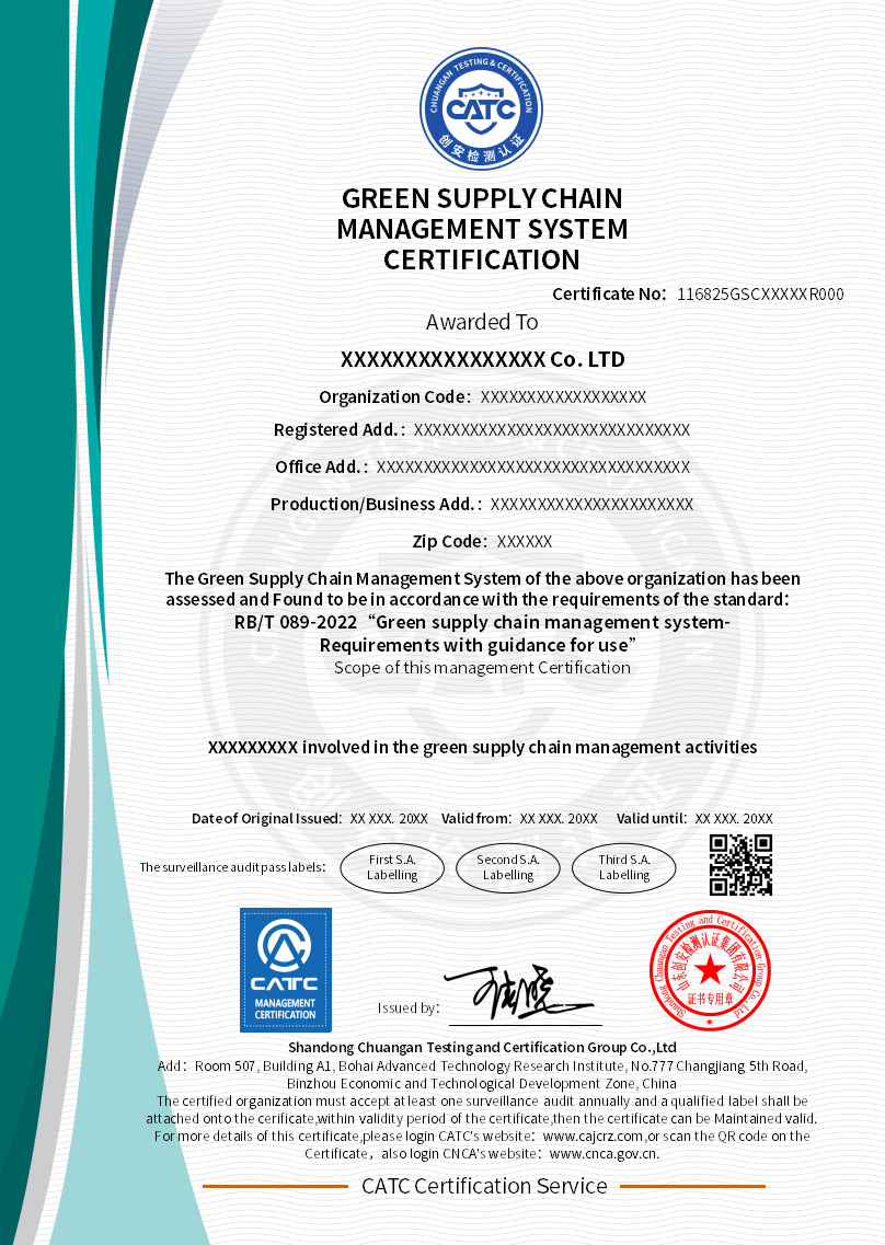 | 认证证书名称 | 绿色供应链管理体系认证证书 |