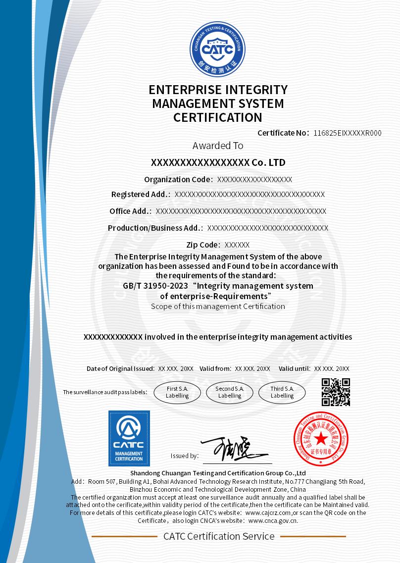 | 认证证书名称 | 企业诚信管理体系认证证书 |