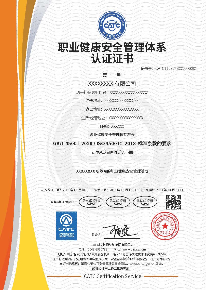 | 认证证书名称 | 职业健康安全管理体系认证证书 |